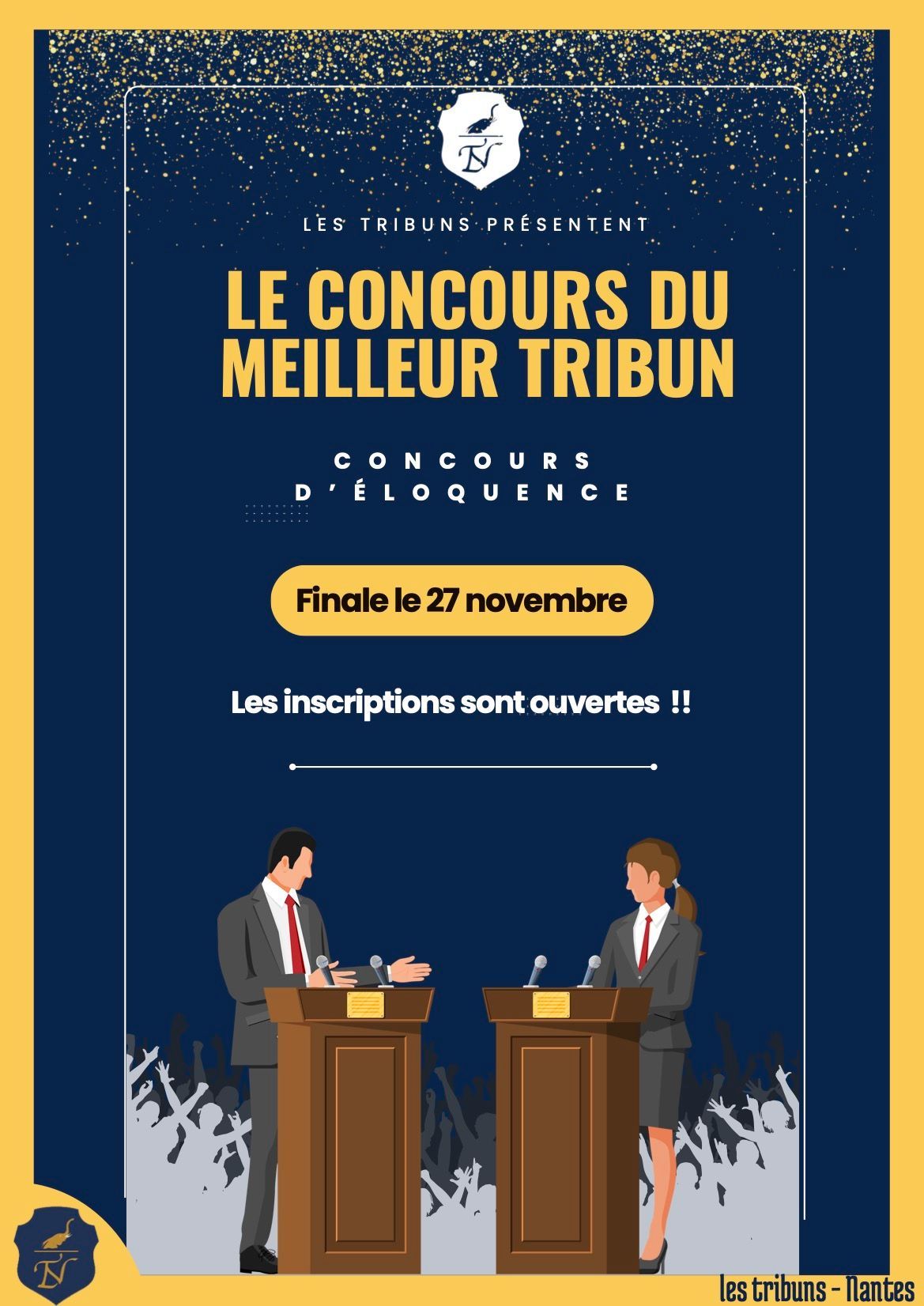 Notre concours du meilleur Tribun revient pour une 7e édition à partir du 19 et 20 novembre pour les demi-finales et le 27 novembre pour la finale, alors à vos discours ! Si vous voulez participer, n’hésitez pas à nous envoyer un message sur notre compte Instagram : @lestribunsnantes :) Et pour les spectateurs vous pourrez venir assister à la compétition du siècle, et voir s'affronter les participants sur des sujets aussi intéressants les uns que les autres...